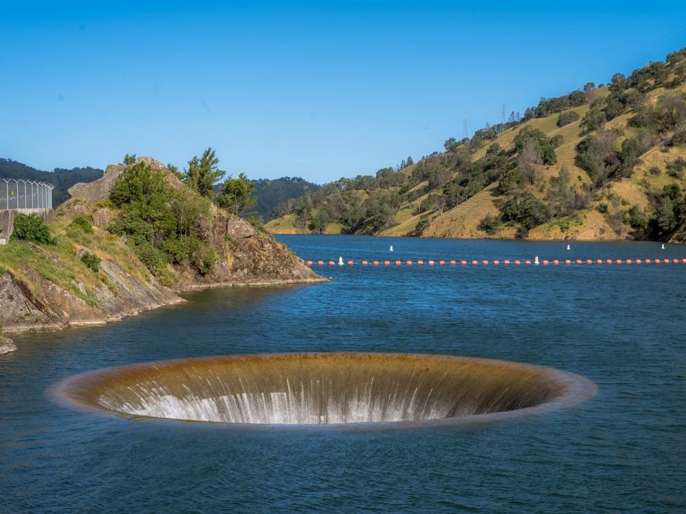 Водоскид є бетонною трубою, вбудованою в схил пагорба, з широким входом, розташованим трохи нижче максимального рівня води в озері. Його діаметр 22 метри дозволяє поглинати величезні обсяги води, створюючи потужний вир, який видно навіть з повітря. Конструкція стійка до тиску води та сейсмічної активності, що важливо у Каліфорнії, де землетруси – не рідкість. Труба спроектована так, щоб мінімізувати турбулентність та забезпечувати плавний стік води в річку нижче греблі.